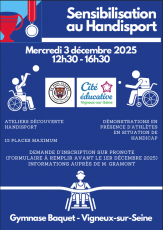 Une sensibilisation au Handisport est proposée à 15 élèves de l’AS Paul Eluard, mercredi 3 décembre 2025, de 12h30 à 16h30, au gymnase Baquet de (...)