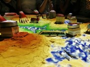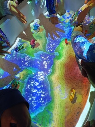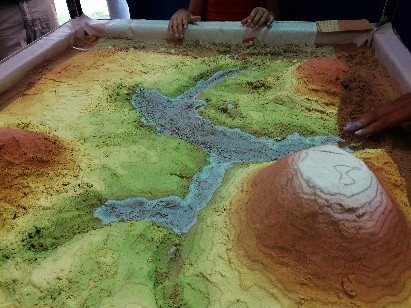 Tous les élèves de 5ème du collège ont ainsi pu mettre leurs mains dans le sable pour modéliser leur territoire, en créant des cours d’eau, en y plaçant leurs habitations, leur collège, les voies ferrées, les routes, les centrales électriques.