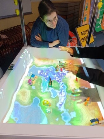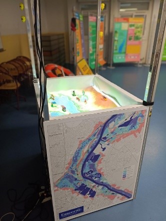 Tandis qu’une grande carte permettait aux élèves de repérer si leur domicile se trouvait en zone inondable, la maquette interactive leur a offert l’opportunité de créer une inondation et d’en mesurer les conséquences.