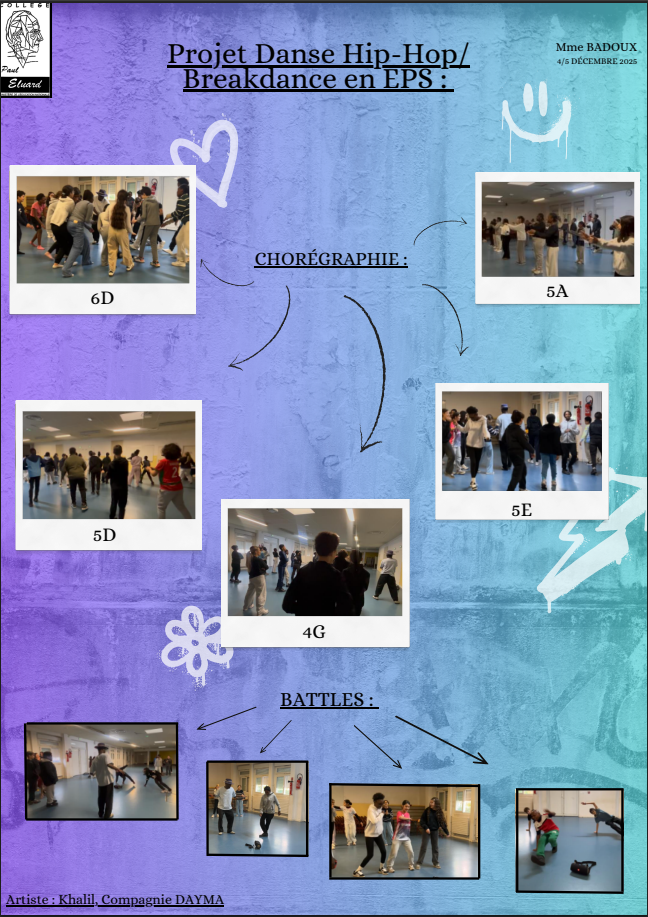 Lors de la matinée du jeudi 4 et vendredi 5 décembre, les élèves des classes de 6D,5A,5D,5E et 4G ont participé au projet “Danse Hip-Hop / BreakDance en EPS”.