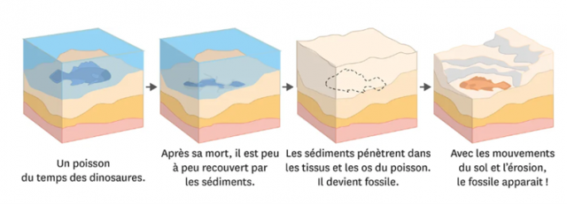 Une fois l’organisme mort, il se dépose au fond d’une zone aqueuse (mer, boue, rivière, zone inondable, etc.) et se fait ensuite recouvrir par un dépôt de sédiments.