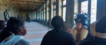 C’est avec étonnement que nos jeunes ont accueilli Marie-Caroline de Toulouse, notre resplendissante guide comédienne parée d’une magnifique robe de soie bleu saphir.